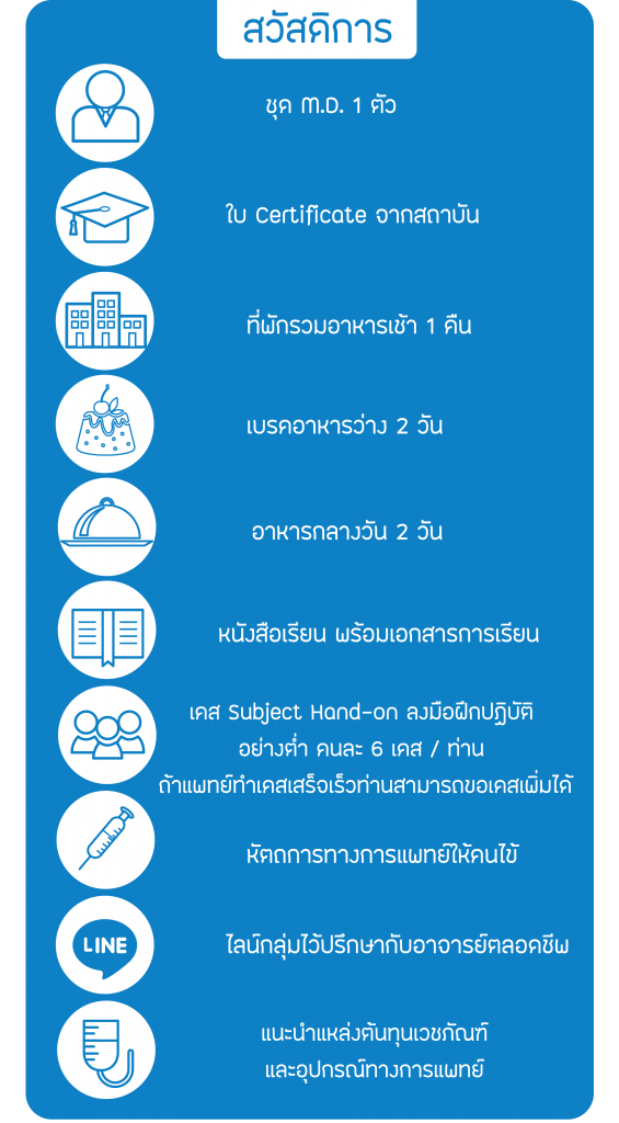 เช่น การฉีดโบทอซ์ การฉีดฟิลเลอร์ การร้อยไหมล็อค การร้อยไหมPDO การฉีดเมโสแฟต การฉีดเมโสหน้าใส และหัตถการอื่นๆ ที่เกี่ยวข้องกับธุรกิจเสริมความงามให้กับแพทย์ที่สนใจและหรือไปประกอบอาชีพในสายงานด้านธุรกิจเสริมความงาม